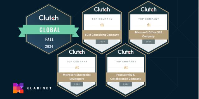 Klarinet Solutions, a trusted leader in digital workplace transformation, is honored to announce our remarkable achievement in the Clutch Fall 2024 Global Awards. This year, Klarinet received recognition in five distinct awards, including the Clutch Fall 2024 Global Award. In addition, Klarinet was named a top firm for Productivity & Collaboration, Microsoft Office 365, Microsoft SharePoint Developers, and Enterprise Content Management (ECM).